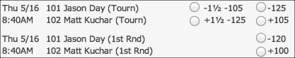 En 5Dimes.eu también puede apostar con spread, ya que se dan las probabilidades de que Jason Day gane 1,5 o más golpes o que Kuchar entre en 1,5 golpes (o supere el día en general). Esto se puede hacer apostando -1,5 o +1,5.